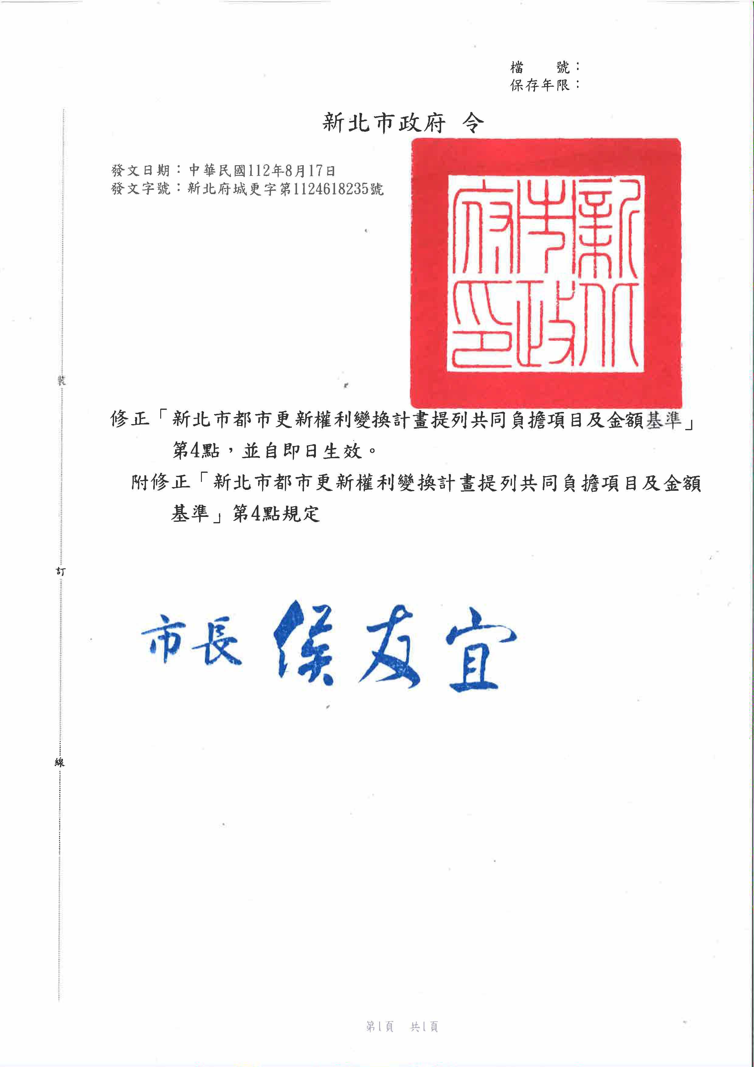 修正「新北市都市更新權利變換計畫 提列共同負擔項目及金額基準」