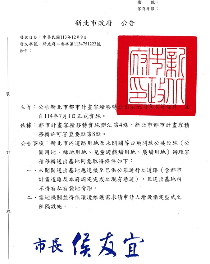 新北市都市計畫容積移轉送出基地同意取得條件